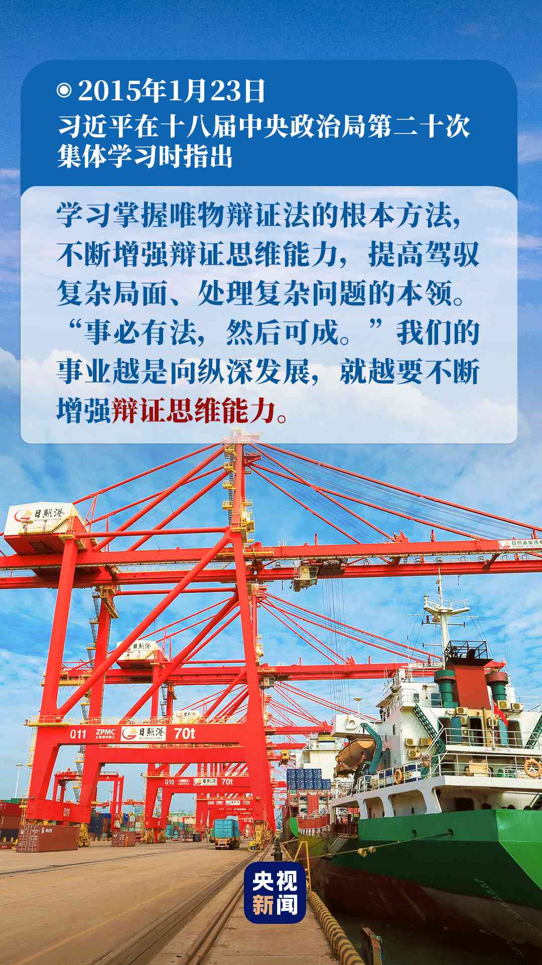 “要堅持發(fā)展地而不是靜止地、全面地而不是片面地、系統(tǒng)地而不是零散地、普遍聯(lián)系地而不是單一孤立地觀察事物,妥善處理各種重大關系。”2015年1月23日,習近平在十八屆中央政治局第二十次集體學習時的講話中,對如何在實際工作中運用唯物辯證法,作出了深刻闡述。