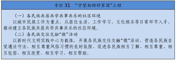 在全社會樹立和突出各民族共享的具有鮮明中華文化特征的文化符號和中華民族視覺形象,打造中國標志。堅定不移推廣普及國家通用語言文字,全面加強國家通用語言文字教育教學,積極穩(wěn)妥推行國家統(tǒng)編教材使用,深化雙語教學模式改革,確保少數(shù)民族學生掌握和使用國家通用語言文字。尊重、支持各少數(shù)民族語言文字的學習和使用。堅持以社會主義先進文化為引領(lǐng),促進各民族文化交融、創(chuàng)新。提倡文明現(xiàn)代的生活方式,引導和幫助各族群眾追求現(xiàn)代文明生活,推進民族進步。強化全體公民日常行為規(guī)范,完善市民公約、鄉(xiāng)規(guī)民約、學生守則、行業(yè)規(guī)章、職業(yè)規(guī)則、團體章程,營造自覺遵法守法、尊重少數(shù)民族風俗習慣和宗教信仰、維護民族團結(jié)的社會氛圍。著力開展興邊富民行動,打牢守邊固邊的民族團結(jié)基礎(chǔ)。