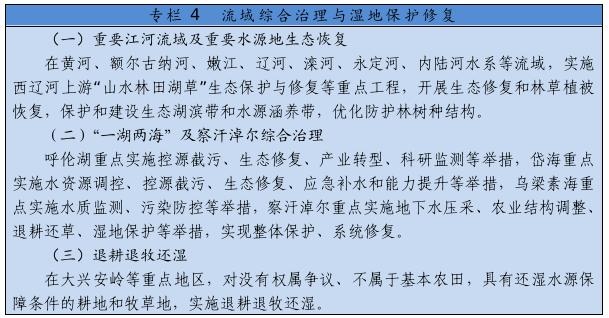大力推進黃河生態(tài)帶建設(shè),統(tǒng)籌水環(huán)境、水生態(tài)、水資源、水安全、水文化,推進干支流一體化治理,突出抓好十大孔兌、多沙粗砂區(qū)集中來源區(qū)等水土保持治理,實施河道和灘區(qū)綜合提升治理工程,完善水沙調(diào)控機制。深化“一湖兩海”及察汗淖爾生態(tài)環(huán)境綜合治理,創(chuàng)新區(qū)域系統(tǒng)治理和流域整體治理舉措,逐步改善生態(tài)環(huán)境。全面加強嫩江、遼河、內(nèi)陸河水系等流域和達里諾爾、烏拉蓋等濕地生態(tài)保護修復,深入開展地下水超采綜合治理。