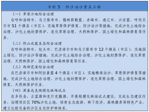 繼續(xù)實施京津風沙源治理等重點工程,推廣庫布其沙漠治理方式和沙產(chǎn)業(yè)模式,推動渾善達克、烏珠穆沁、呼倫貝爾沙地治理。推進規(guī)模化林場建設(shè),采取人工造林、封沙育林、飛播造林等方式恢復植被。建設(shè)荒漠綠洲防護林、防風固沙林、沙漠鎖邊林、農(nóng)田草牧場防護林以及水土保持林。以干旱半干旱草原為重點,加強草場改良和人工種草,實行圍封禁牧、劃區(qū)輪牧、季節(jié)性休牧、舍飼圈養(yǎng)等措施,保護和恢復草原植被。以內(nèi)蒙古高原等為重點,推進防護林體系建設(shè)及退化林修復、退化草原修復、京津風沙源治理。新增水土流失綜合治理3.33萬平方公里。
