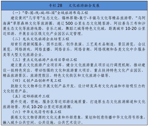 建立健全把社會效益放在首位、社會效益和經(jīng)濟效益相統(tǒng)一的文化創(chuàng)作生產(chǎn)體制機制。完善文化管理體制和生產(chǎn)經(jīng)營機制。健全現(xiàn)代文化產(chǎn)業(yè)體系和市場體系。完善文化和旅游融合發(fā)展體制機制。推進內(nèi)蒙古藝術(shù)劇院等國有文藝院團和烏蘭牧騎改革。完善文化企業(yè)履行社會責任制度,健全引導新型文化業(yè)態(tài)健康發(fā)展機制。深化國有文化企業(yè)改革,加快重組整合、結(jié)構(gòu)調(diào)整、多元化發(fā)展。健全文物保護利用法律制度和標準規(guī)范。設(shè)立文化產(chǎn)業(yè)發(fā)展專項資金。