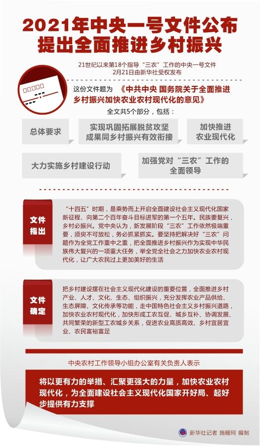 新華社北京2月21日電(記者胡璐、于文靜)21世紀以來第18個指導“三農(nóng)”工作的中央一號文件21日由新華社受權發(fā)布。