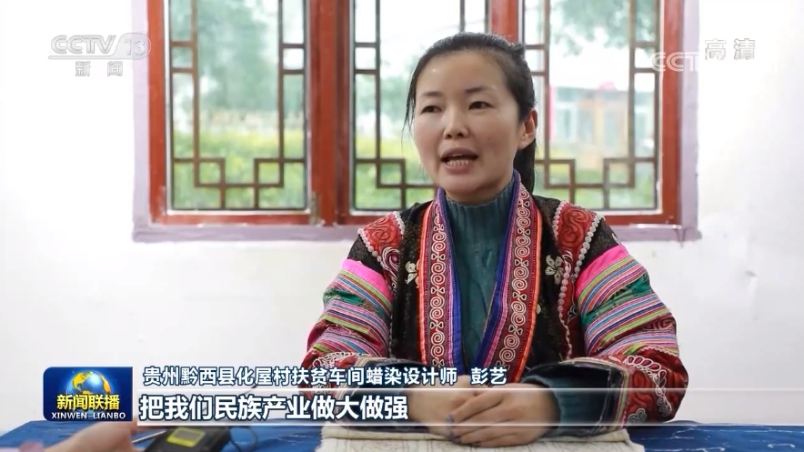 貴州黔西縣化屋村扶貧車間蠟染設(shè)計(jì)師彭藝:把我們民族產(chǎn)業(yè)做大做強(qiáng),讓我們苗族同胞的生活,過得像我們蠟染刺繡一樣精彩。