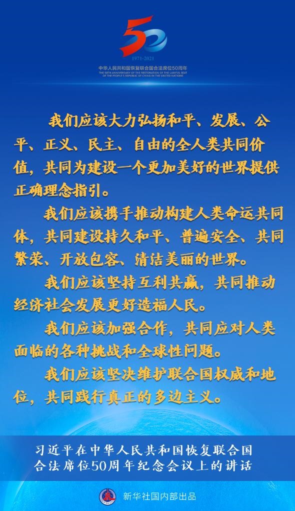 2021年10月25日,國家主席習近平在北京出席中華人民共和國恢復聯(lián)合國合法席位50周年紀念會議并發(fā)表重要講話。新華社記者李響攝