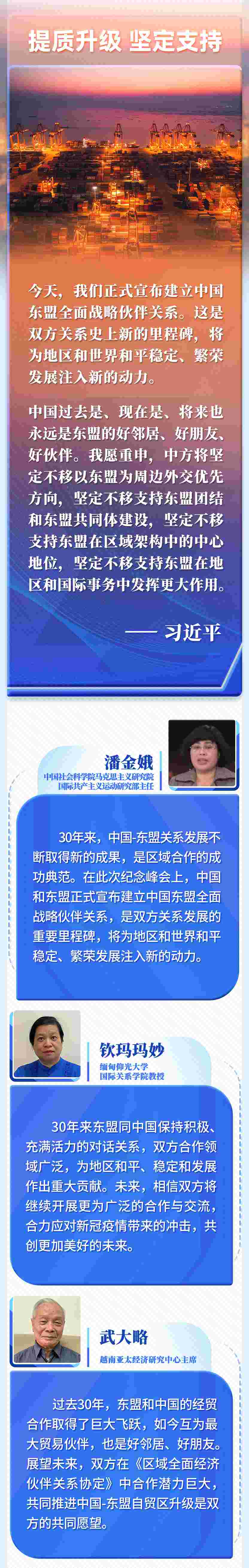 30年的寶貴經(jīng)驗(yàn)是中國(guó)和東盟的共同財(cái)富,為雙方發(fā)展全面戰(zhàn)略伙伴關(guān)系奠定了基礎(chǔ)、提供了遵循。我們要倍加珍惜、長(zhǎng)久堅(jiān)持,并在新的實(shí)踐中不斷豐富和發(fā)展。