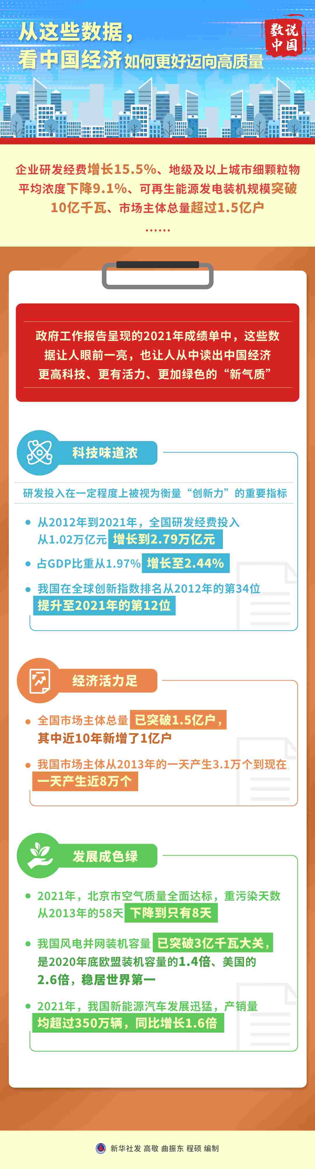企業(yè)研發(fā)經(jīng)費(fèi)增長(zhǎng)15.5%、市場(chǎng)主體總量超過(guò)1.5億戶、可再生能源發(fā)電裝機(jī)規(guī)模突破10億千瓦……政府工作報(bào)告呈現(xiàn)的2021年成績(jī)單中,這些數(shù)據(jù)讓人眼前一亮。同時(shí),報(bào)告的一系列新部署,也讓人從中讀出中國(guó)經(jīng)濟(jì)更重創(chuàng)新、更加綠色,更堅(jiān)定邁向高質(zhì)量發(fā)展。
