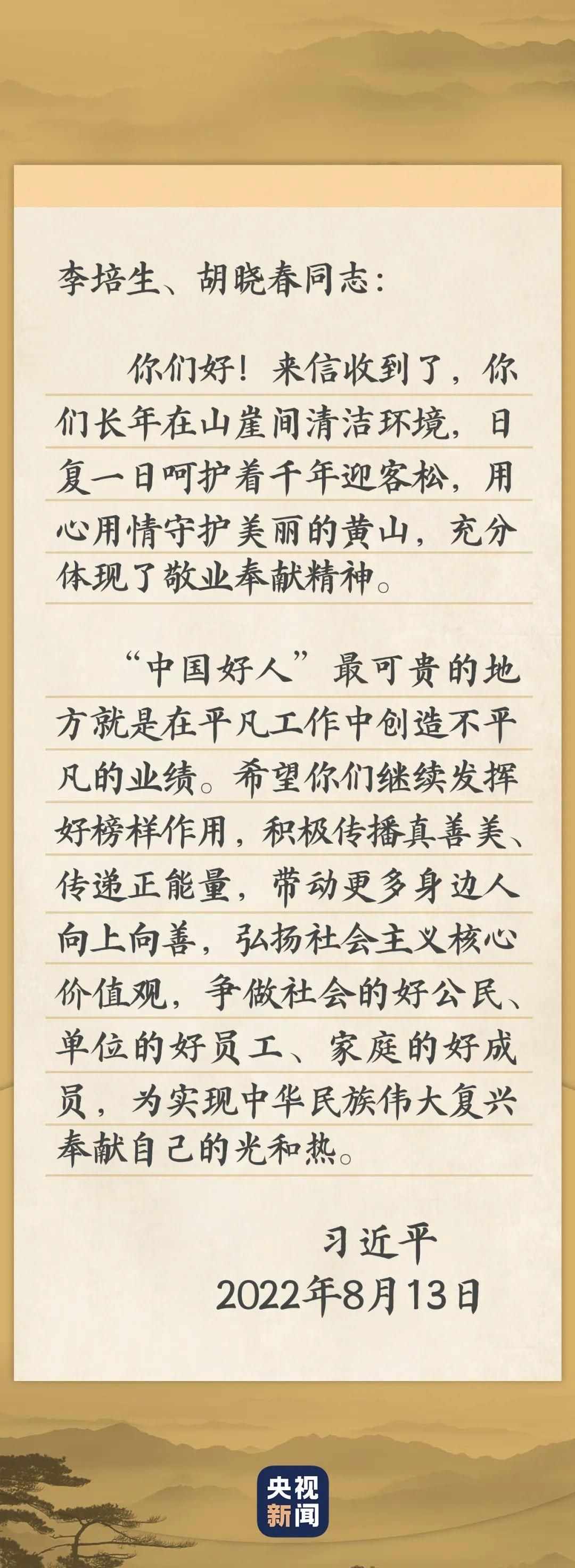 “真沒(méi)有想到習(xí)近平總書記給我們回信了,這份巨大的鼓舞不僅是給我們倆,也是給黃山的,更是給所有‘中國(guó)好人’的。”接到書信的李培生和胡曉春,前行的動(dòng)力十足。