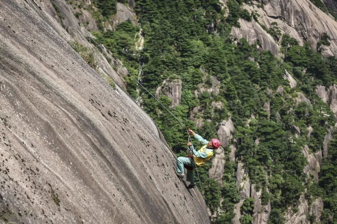 李培生是黃山景區(qū)的一名環(huán)衛(wèi)放繩工。這份工作需要在懸崖峭壁上揀拾隨風(fēng)落向山谷的塑料袋、游客掉下的物品。
