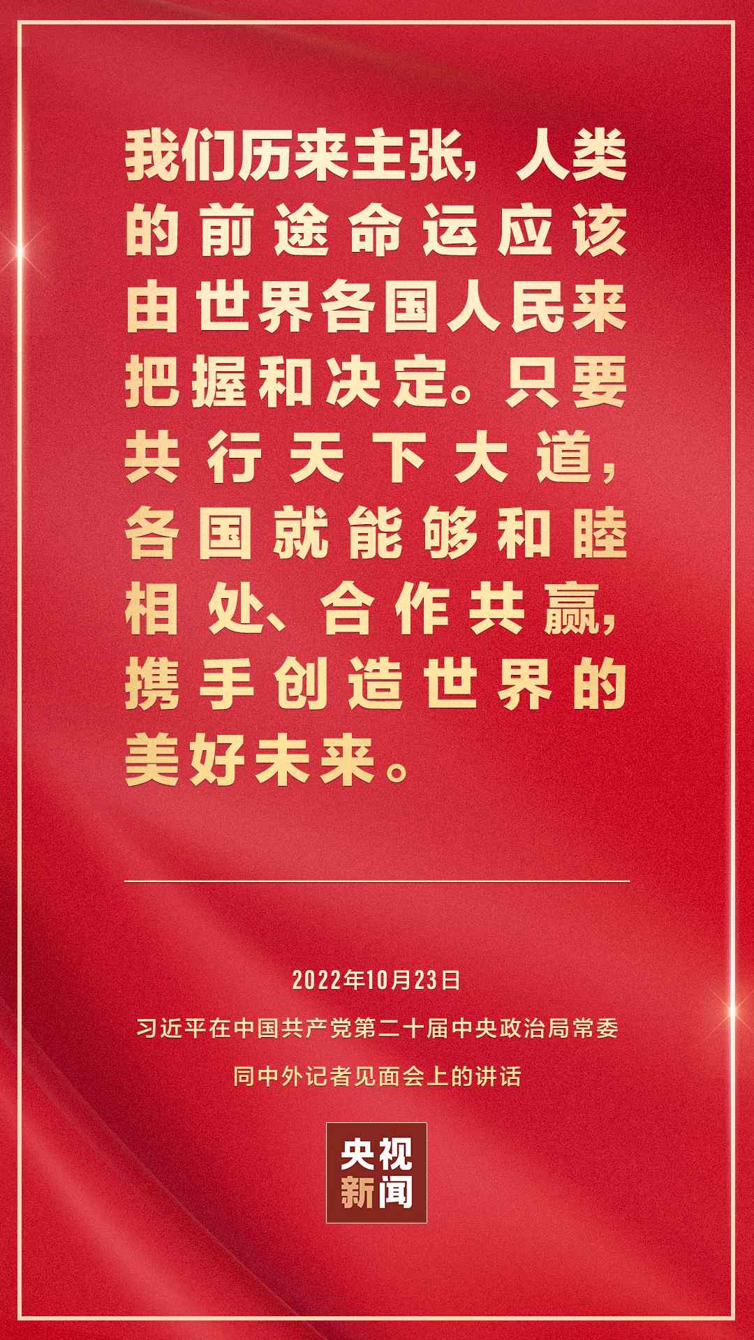 在中國共產黨第二十屆中央委員會第一次全體會議上當選的中共中央總書記習近平和中共中央政治局常委李強、趙樂際、王滬寧、蔡奇、丁薛祥、李希,23日中午在人民大會堂同采訪中共二十大的中外記者見面。習近平發(fā)表重要講話。