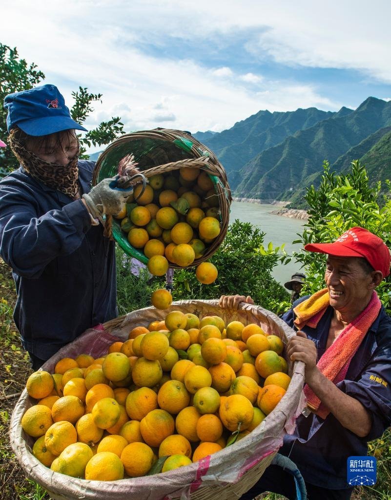 湖北省宜昌市秭歸縣沙鎮(zhèn)溪鎮(zhèn)臺(tái)子灣村村民在柑橘園里轉(zhuǎn)運(yùn)夏橙(2022年6月21日攝)。新華社發(fā)(鄭家裕 攝)