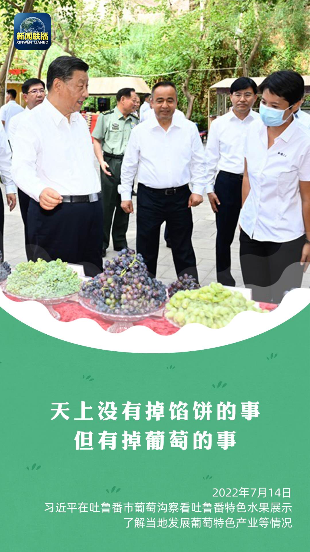 “多么富饒的一個(gè)地方,瓜果飄香。這是大自然的饋贈(zèng)?!笨倳涳L(fēng)趣地說(shuō),“天上沒(méi)有掉餡餅的事,但有掉葡萄的事?!笨倳涍€強(qiáng)調(diào),要推動(dòng)文化和旅游融合發(fā)展,打造富民產(chǎn)業(yè)。