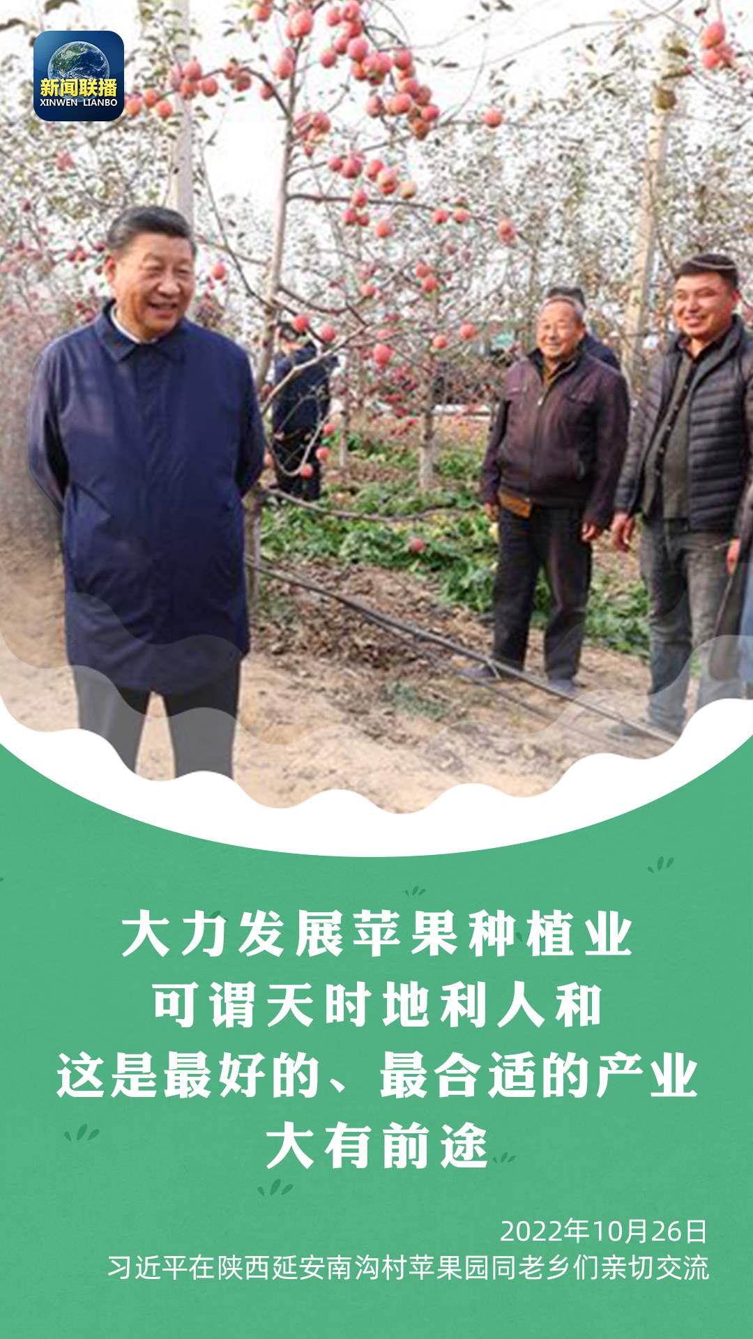 考察當(dāng)天,得知南溝村滴灌技術(shù)、矮化種植技術(shù)等不斷發(fā)展,而且蘋果不愁銷路,總書記高興地說(shuō):“大力發(fā)展蘋果種植業(yè)可謂天時(shí)地利人和,這是最好的、最合適的產(chǎn)業(yè),大有前途。”