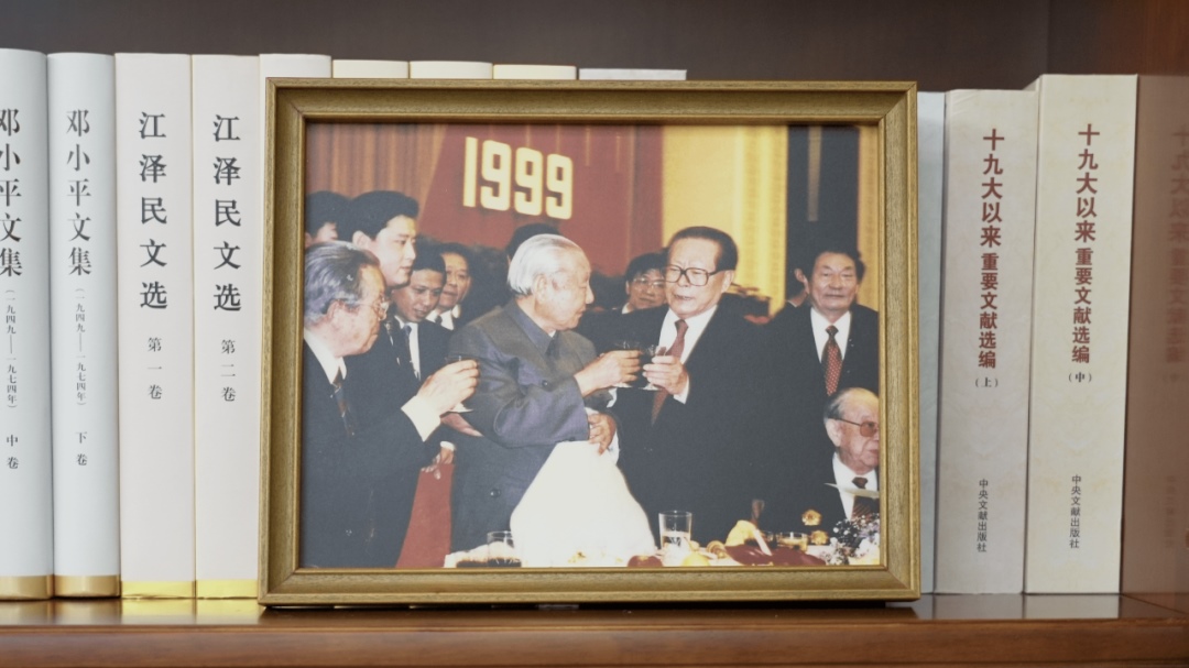 書架上擺放著一張合影。這是1999年9月30日,江澤民同志、朱镕基同志、習(xí)仲勛同志在慶祝建國五十周年招待會(huì)上。這張照片第一次出現(xiàn)在習(xí)近平總書記的書架上。