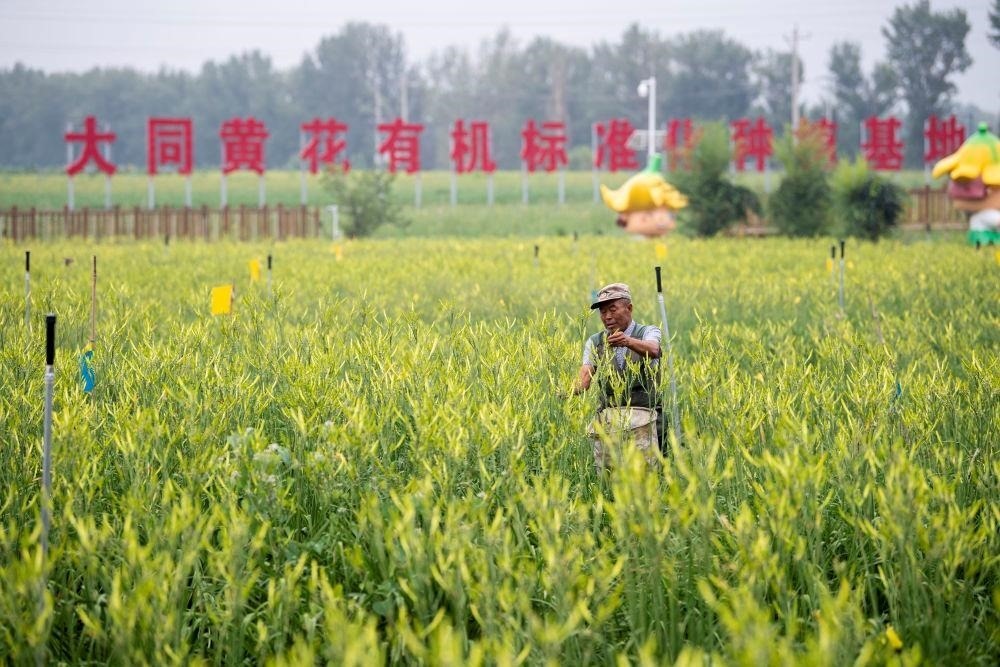 △村民在山西大同黃花有機標準化種植基地內采摘黃花。