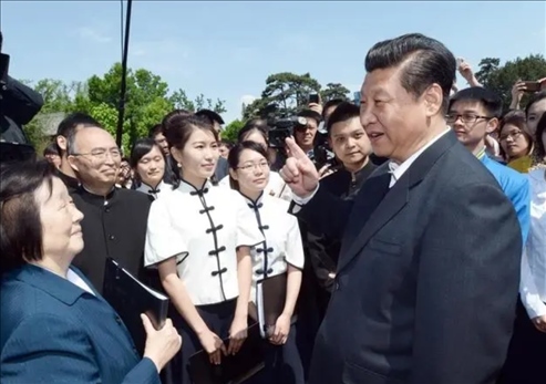 △2014年5月4日,習(xí)近平總書(shū)記在北京大學(xué)校園觀看北大師生紀(jì)念五四運(yùn)動(dòng)95周年青春詩(shī)會(huì)時(shí)同朗誦者親切交談。
