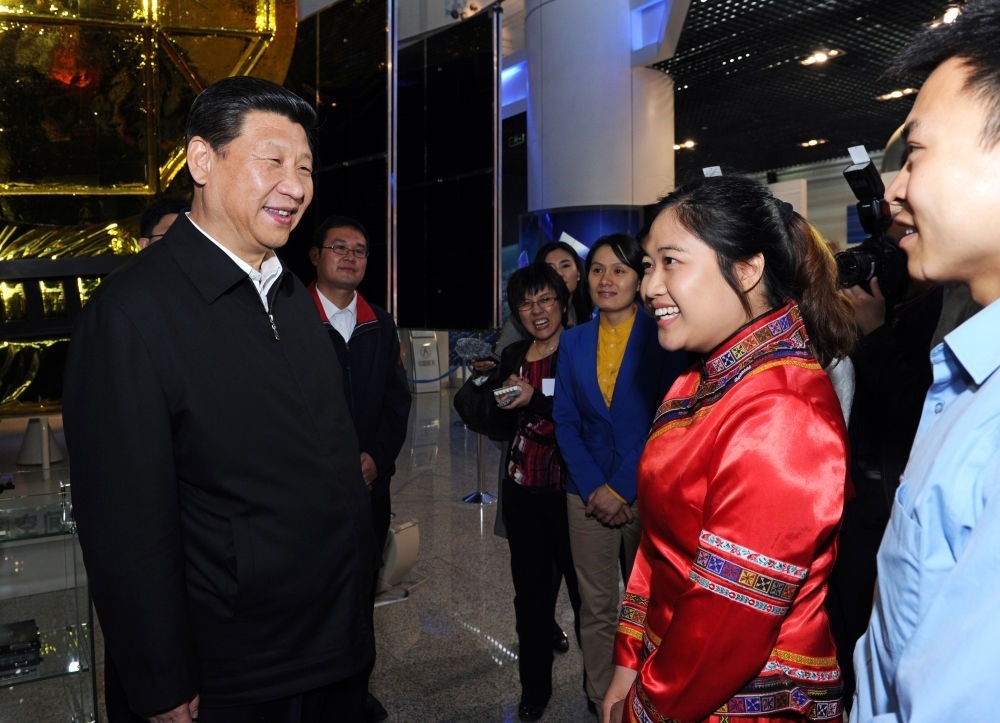 2013年5月4日,習(xí)近平來到中國航天科技集團公司中國空間技術(shù)研究院,同各界優(yōu)秀青年代表座談并發(fā)表重要講話。這是座談會前,習(xí)近平和在展廳參觀的優(yōu)秀青年代表交談。