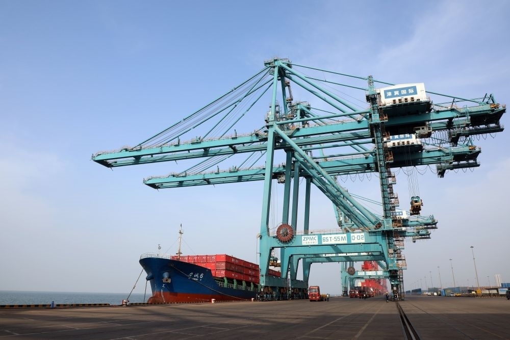 3月9日,船舶停靠在黃驊港綜合港區(qū)集裝箱碼頭進行卸船作業(yè)。新華社記者 駱學峰 攝