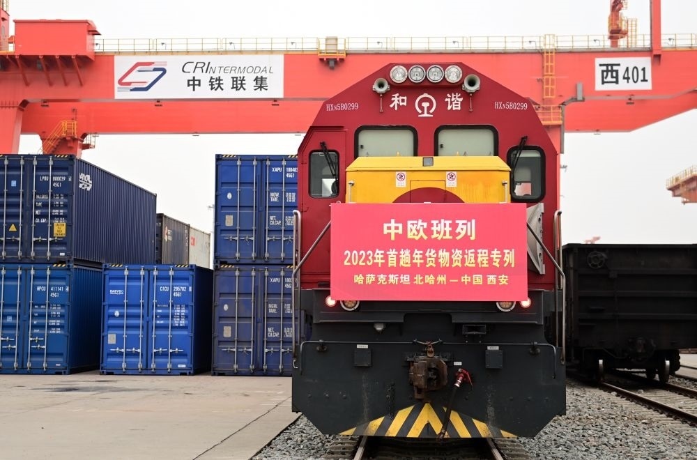 滿(mǎn)載著來(lái)自哈薩克斯坦1300噸面粉的中歐班列抵達(dá)西安國(guó)際港站(1月13日攝)。新華社記者 李一博 攝