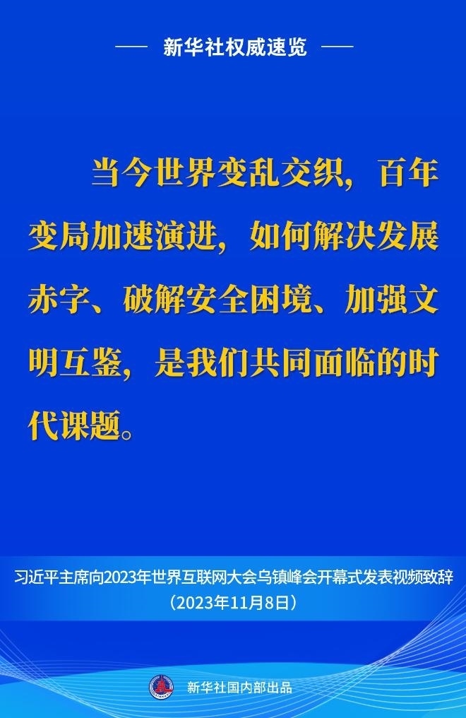 習(xí)近平主席向2023年世界互聯(lián)網(wǎng)大會(huì)烏鎮(zhèn)峰會(huì)開(kāi)幕式視頻致辭金句 11月8日上午,國(guó)家主席習(xí)近平向2023年世界互聯(lián)網(wǎng)大會(huì)烏......