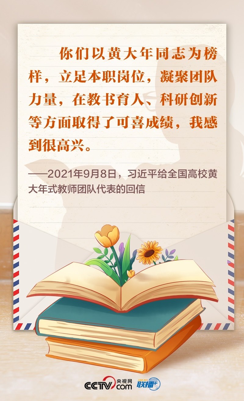 2021年,首批黃大年式教師團(tuán)隊(duì)的代表給總書記寫信,匯報(bào)教學(xué)、科研等工作情況,表達(dá)了堅(jiān)守教育報(bào)國理想、為民族復(fù)興貢獻(xiàn)力量的決心??倳浕匦趴隙舜蠹业墓ぷ鞒尚?,勉勵(lì)大家繼續(xù)學(xué)習(xí)弘揚(yáng)黃大年同志等優(yōu)秀教師的高尚精神,立德修身,潛心治學(xué),開拓創(chuàng)新,真正把為學(xué)、為事、為人統(tǒng)一起來,當(dāng)好學(xué)生成長的引路人。