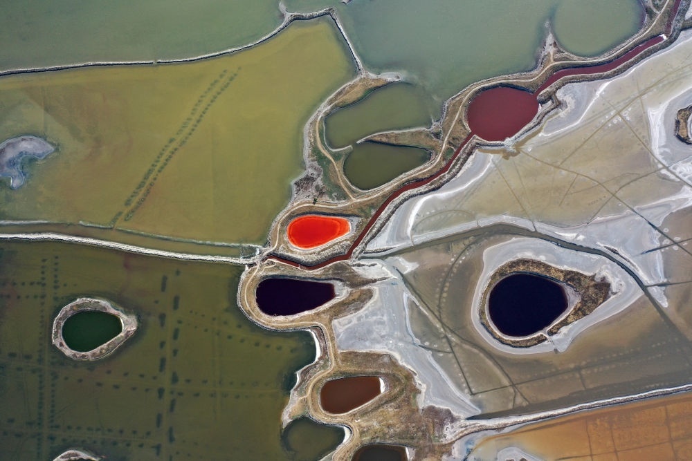 山西運(yùn)城鹽湖一角(2021年6月1日攝,無(wú)人機(jī)照片)。新華社記者 詹彥 攝