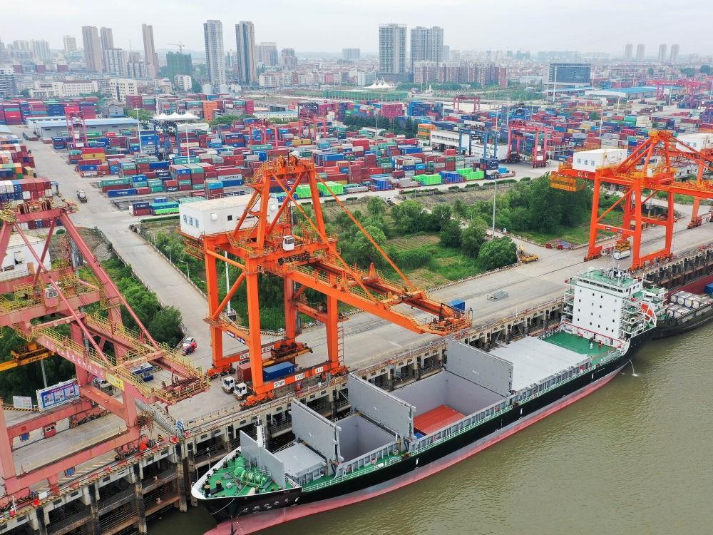 “華航漢亞2號(hào)”貨輪??吭谖錆h新港陽(yáng)邏集裝箱碼頭進(jìn)行裝箱作業(yè)(2020年5月9日攝,無(wú)人機(jī)照片)。新華社發(fā)(趙軍 攝)