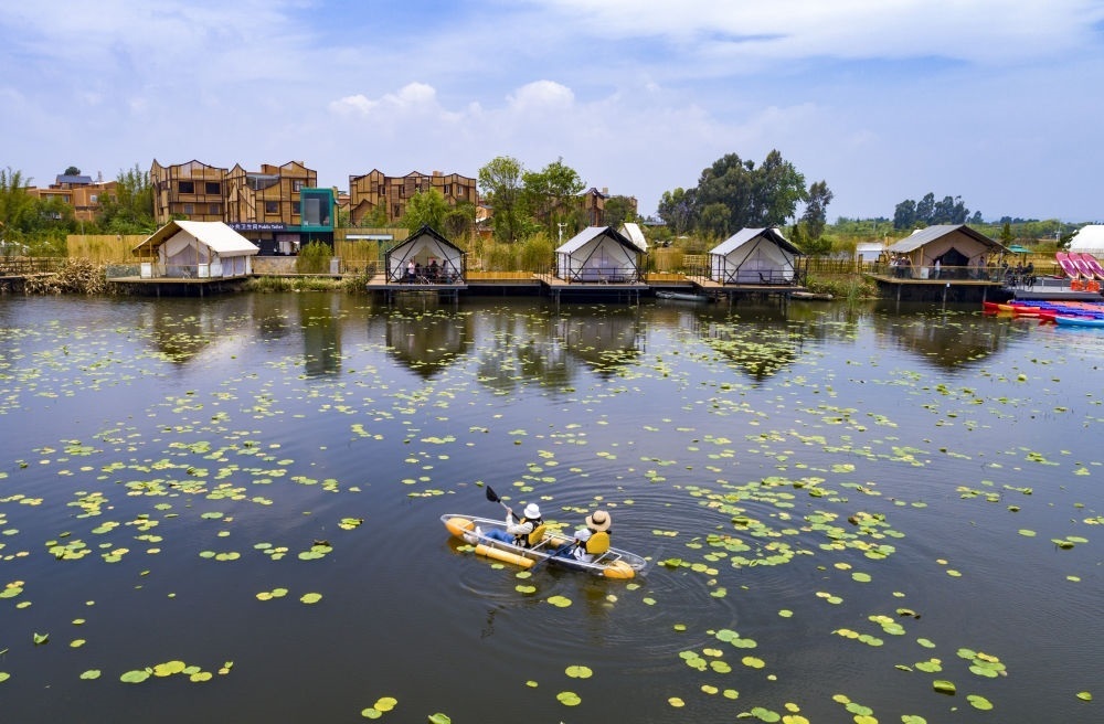 游人在滇池南岸晉寧區(qū)上蒜鎮(zhèn)小漁村劃船休閑(2023年4月30日攝,無人機照片)。新華社記者 陳欣波 攝