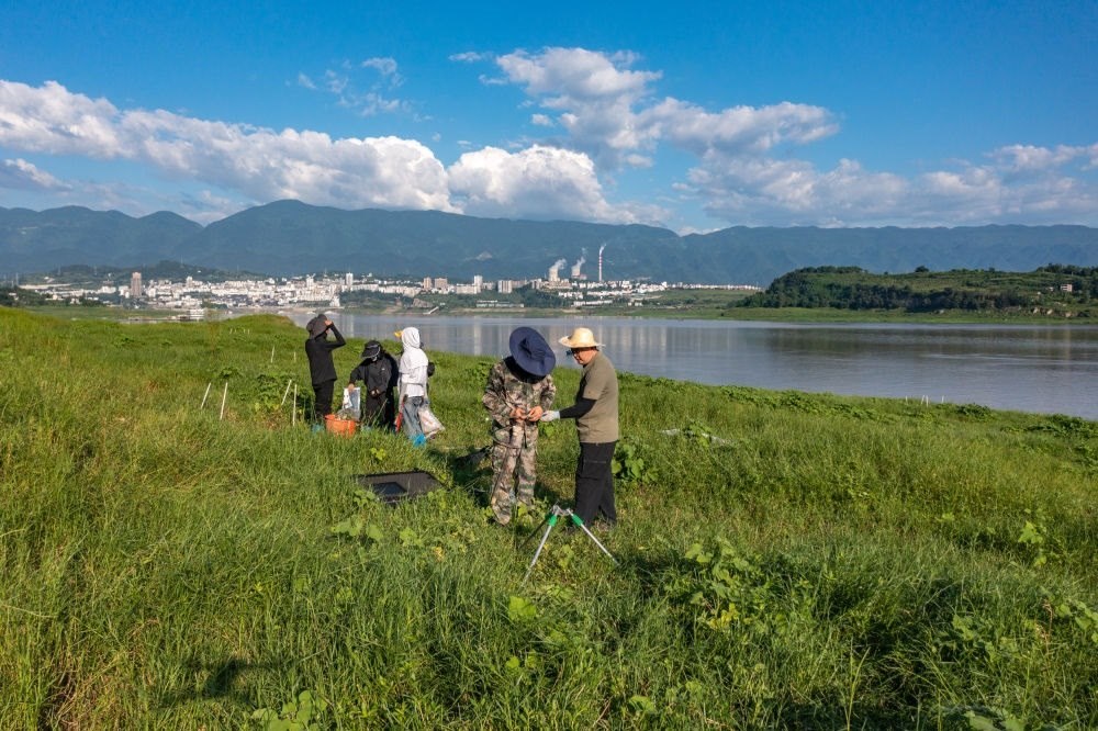 在位于重慶的中國科學院三峽庫區(qū)水土保持與環(huán)境研究站,中國科學院成都山地所科研人員在庫區(qū)消落帶上開展相關(guān)監(jiān)測(2023年7月5日攝,無人機照片)。新華社記者 黃偉 攝