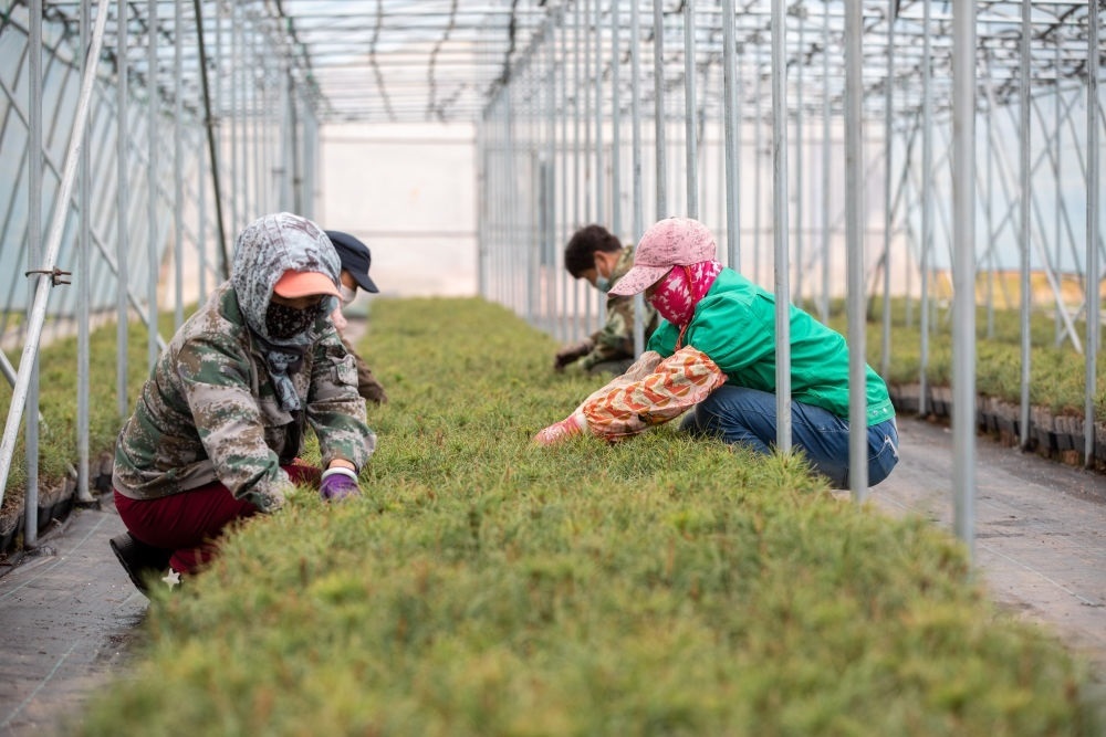 在黑龍江伊春森工集團紅松種苗繁育基地,工作人員在養(yǎng)護輕基質(zhì)紅松苗(2023年5月20日攝)。新華社記者 張濤 攝