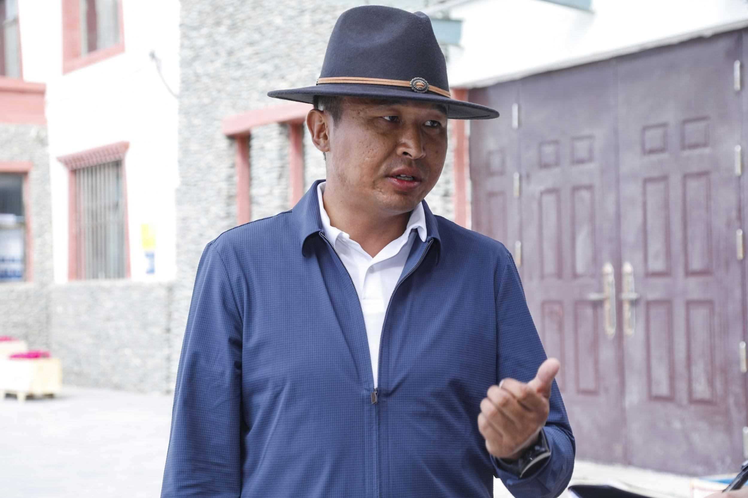 2023年7月22日,在長江源村文化廣場前,唐古拉山鎮(zhèn)黨委書記索南東主分享他參與長江生態(tài)保護的心得。王箏 攝