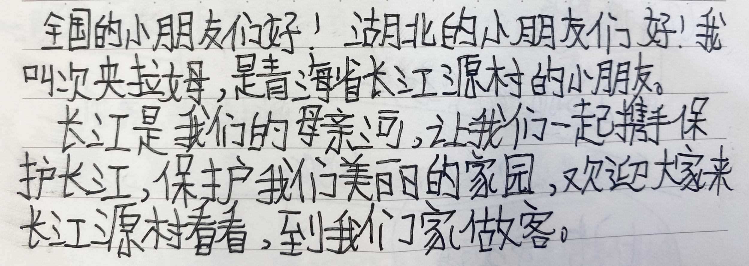 “全國的小朋友們好!湖北的小朋友們好!我叫次央拉姆,是青海省長江源村的小朋友。長江是我們的母親河,讓我們一起攜手保護長江,保護我們美麗的家園!歡迎大家來長江源看看,到我們家做客!”
