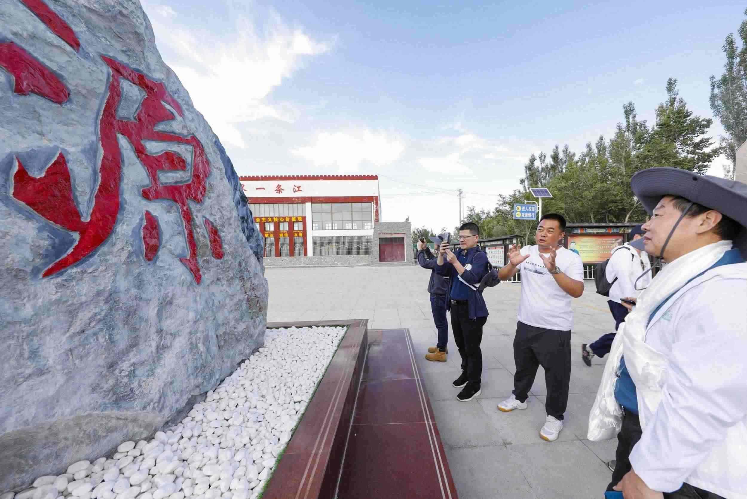 2023年7月22日,格爾木市長江源民族學校校長李軍(左三)講解該校以生態(tài)文明為特色的校園文化。王箏 攝