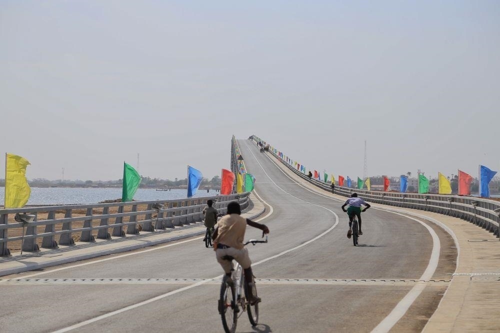 △2022年1月16日,人們騎車通過位于塞內加爾方久尼市、由中國公司承建的方久尼大橋。