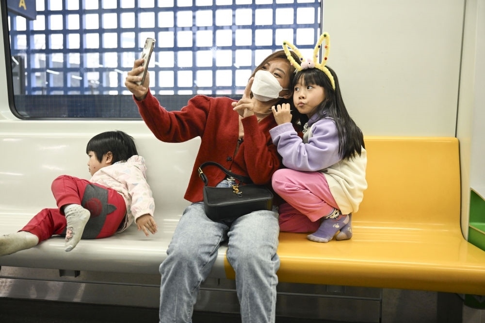 2023年12月9日,市民在越南河內(nèi)吉靈-河?xùn)|線輕軌車(chē)廂里自拍。新華社記者程一恒攝