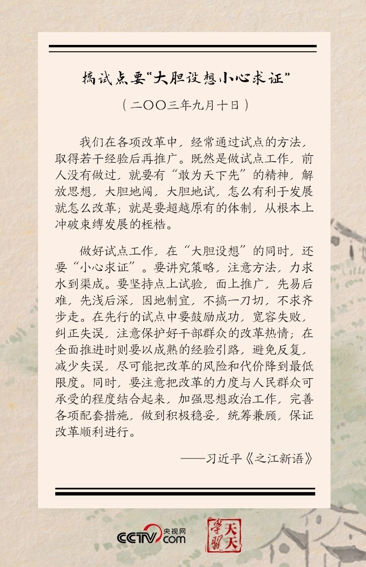 習(xí)近平還進(jìn)一步分析,做好試點工作,在“大膽設(shè)想”的同時,還要“小心求證”……要堅持點上試驗,面上推廣,先易后難,先淺后深,因地制宜,不搞一刀切,不求齊步走……