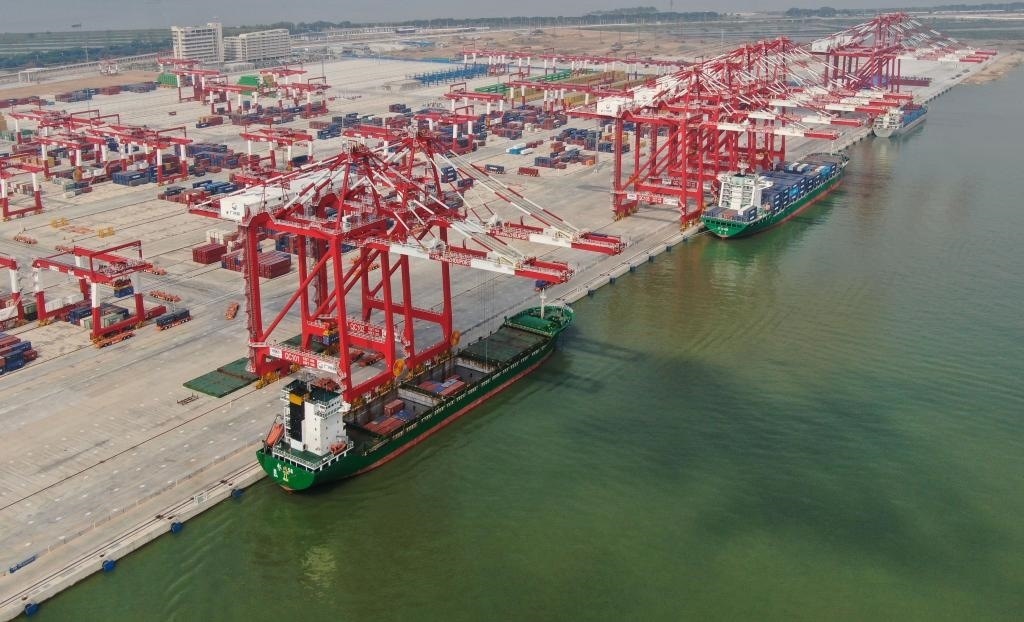 這是2022年7月28日拍攝的廣州港南沙港區(qū)四期全自動(dòng)化碼頭(無人機(jī)照片)。新華社記者鄧華攝