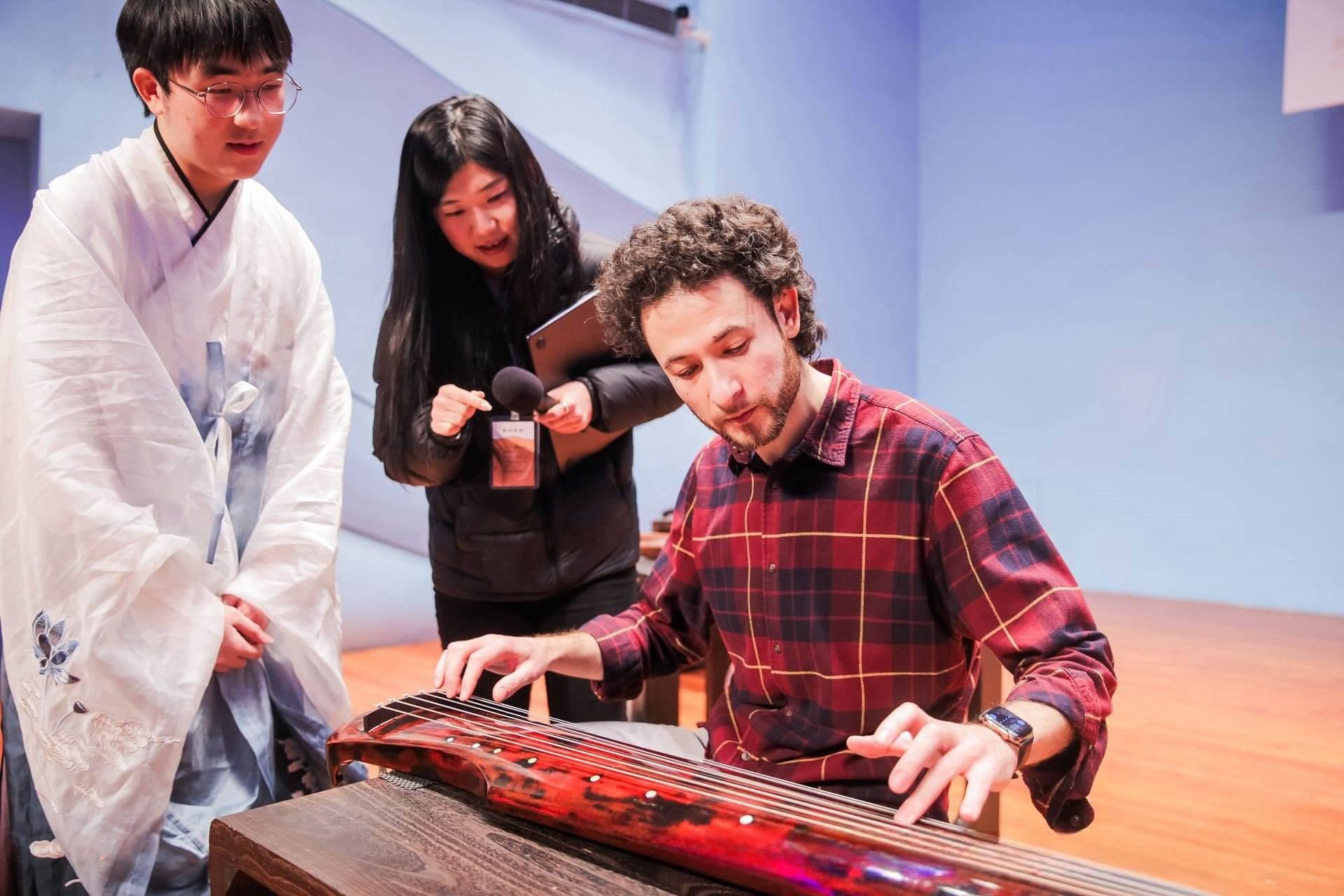(▲俄羅斯圣彼得堡交響樂團指揮迪米特里斯·博蒂尼斯體驗中國古琴)