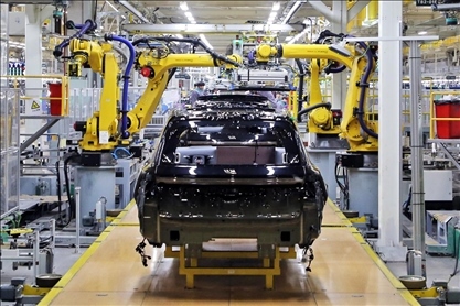 △ 2023年12月10日,江蘇常州一汽車基地的生產(chǎn)車間,機器臂在組裝新能源汽車。