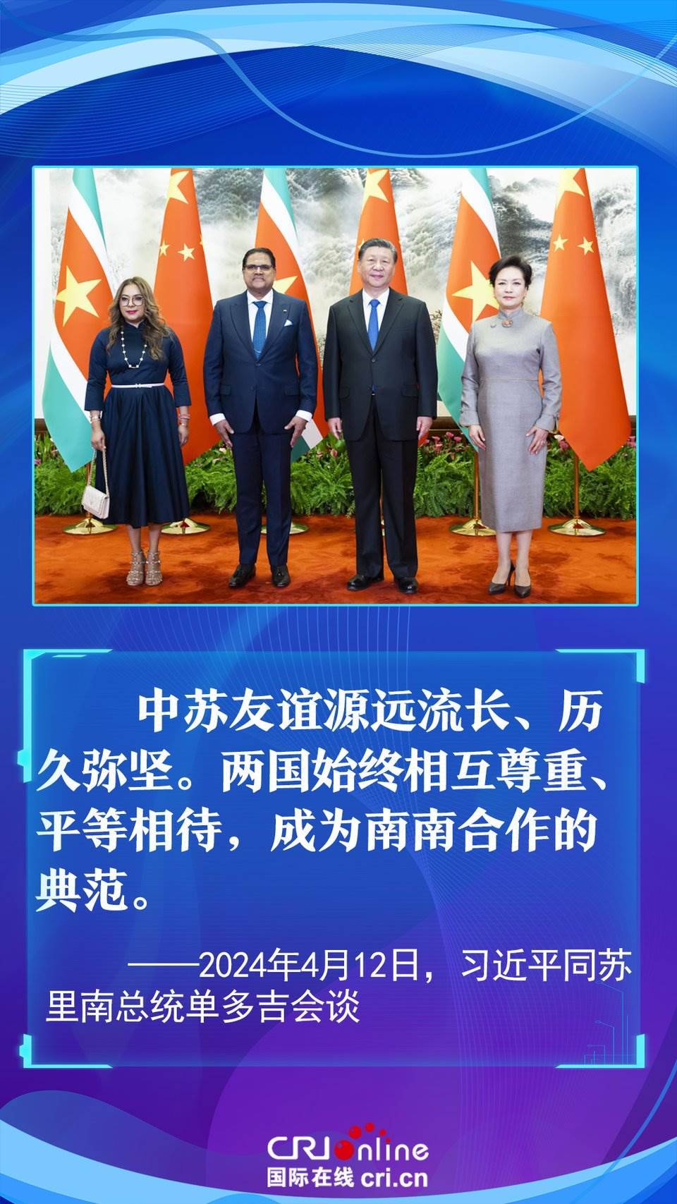 今年是中國和蘇里南建立戰(zhàn)略合作伙伴關(guān)系五周年。習(xí)近平主席在會談中以“源遠流長、歷久彌堅”為中蘇友誼增添了新的注解,為推動構(gòu)建更加緊密的中蘇戰(zhàn)略合作伙伴關(guān)系指明了方向。