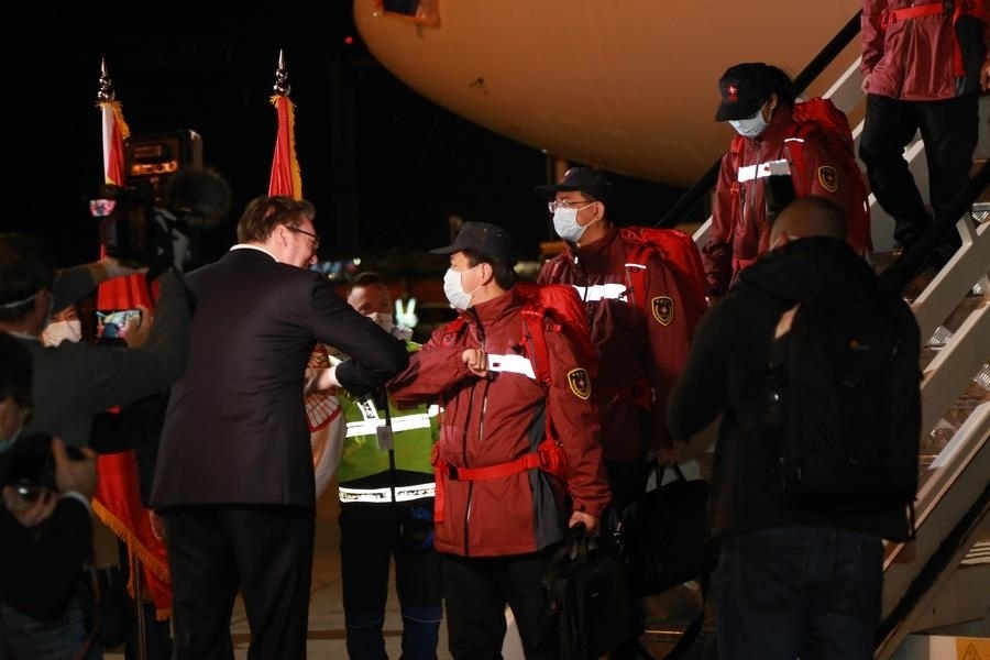 中國醫(yī)療團(tuán)隊(duì)在貝爾格萊德尼古拉·特斯拉機(jī)場降落時已是深夜。武契奇率領(lǐng)塞方多名高級官員到機(jī)場迎接。疫情期間不建議握手,于是這位塞爾維亞領(lǐng)導(dǎo)人選擇和中國專家團(tuán)成員一一碰肘以示尊重。對中國的及時支援心懷感激,他還在機(jī)場親吻了一面五星紅旗。