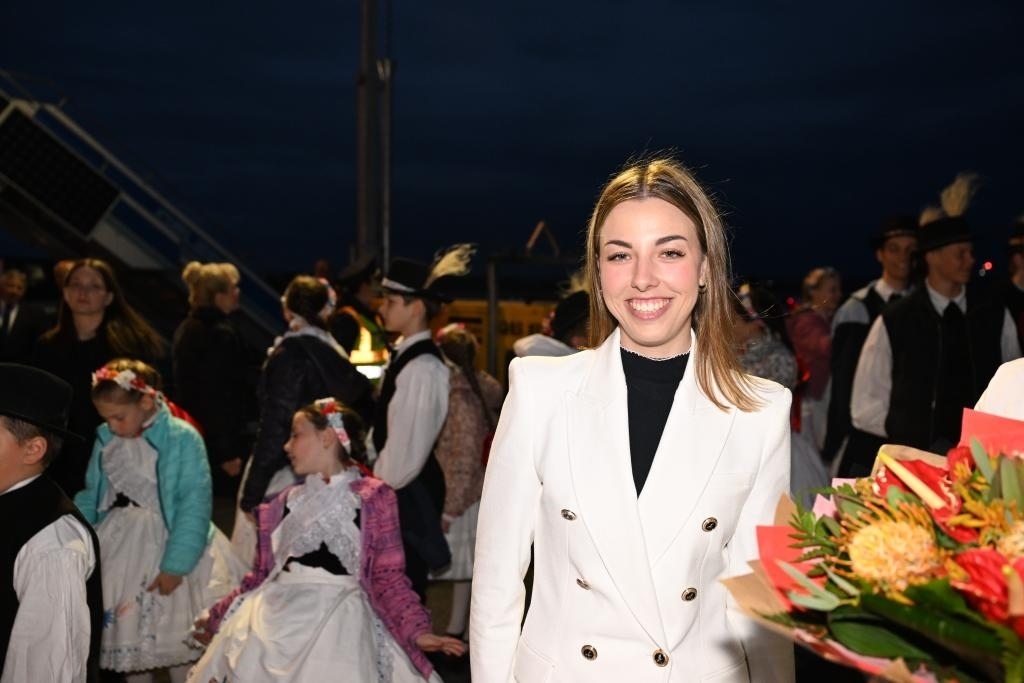 當(dāng)?shù)貢r(shí)間5月8日晚,在匈牙利布達(dá)佩斯國際機(jī)場歡迎隊(duì)伍中的匈牙利姑娘歐拉·塔瑪拉。新華社記者謝環(huán)馳攝