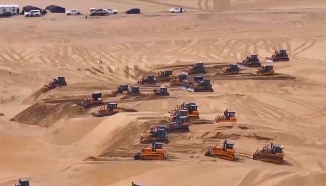 在內(nèi)蒙古鄂爾多斯的茫茫沙海中,近200臺推土機(jī)來回穿行,推平高低起伏、連綿不斷的沙丘,以便后續(xù)在此安裝光伏板。這正是當(dāng)下最新的光伏治沙模式中的一個(gè)環(huán)節(jié)。