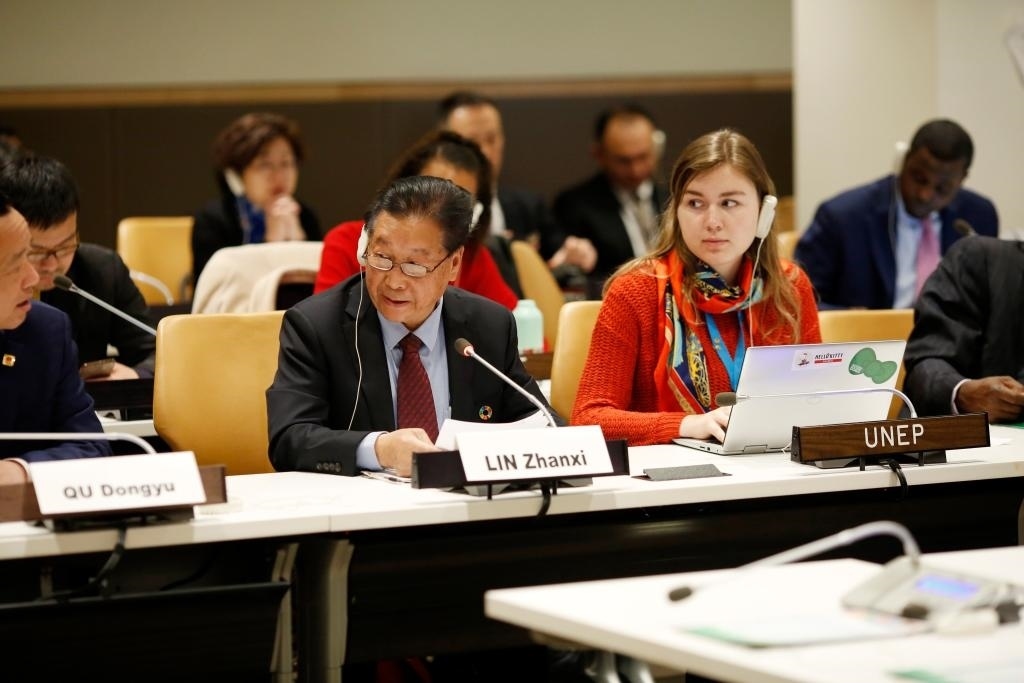 2019年4月18日,在位于紐約的聯(lián)合國總部,林占熺(前排中)在“菌草技術:‘一帶一路’倡議對促進落實聯(lián)合國2030年可持續(xù)發(fā)展議程的實質性貢獻”專題研討會上發(fā)言。新華社記者 李木子 攝
