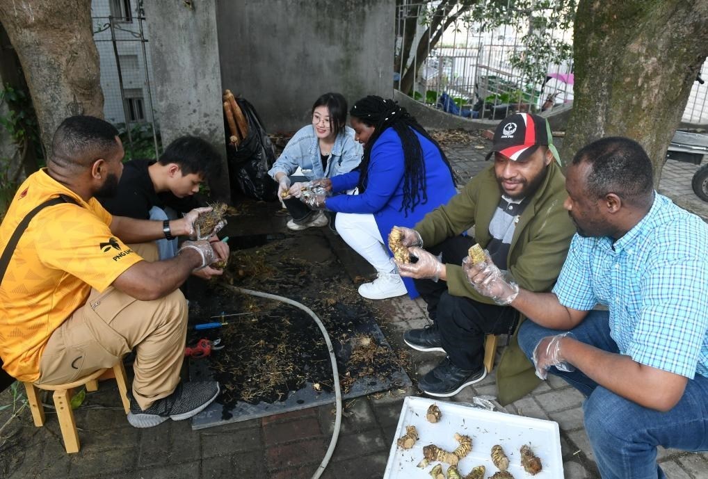 3月28日,在位于福州的福建農(nóng)林大學,來自盧旺達和巴布亞新幾內亞的學生與菌草專業(yè)學生交流。新華社記者 林善傳 攝