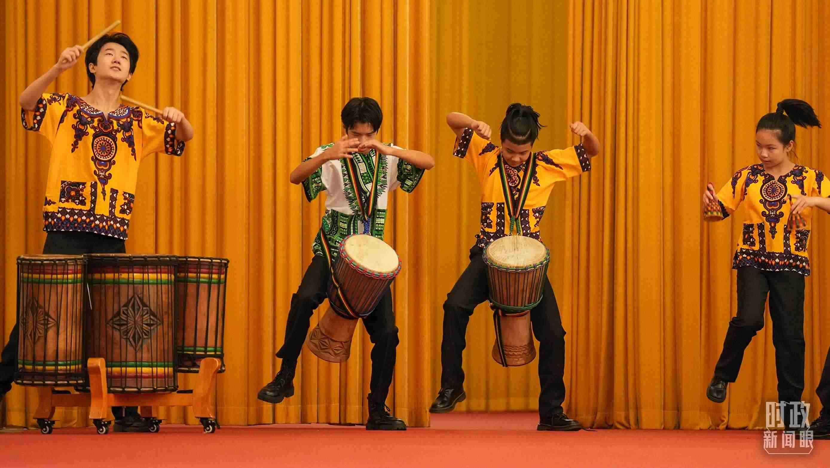 在前往宴會廳沿途,身著中國民族服裝和非洲特色服裝的青少年,打起歡快的非洲鼓,載歌載舞歡迎遠(yuǎn)道而來的貴賓。