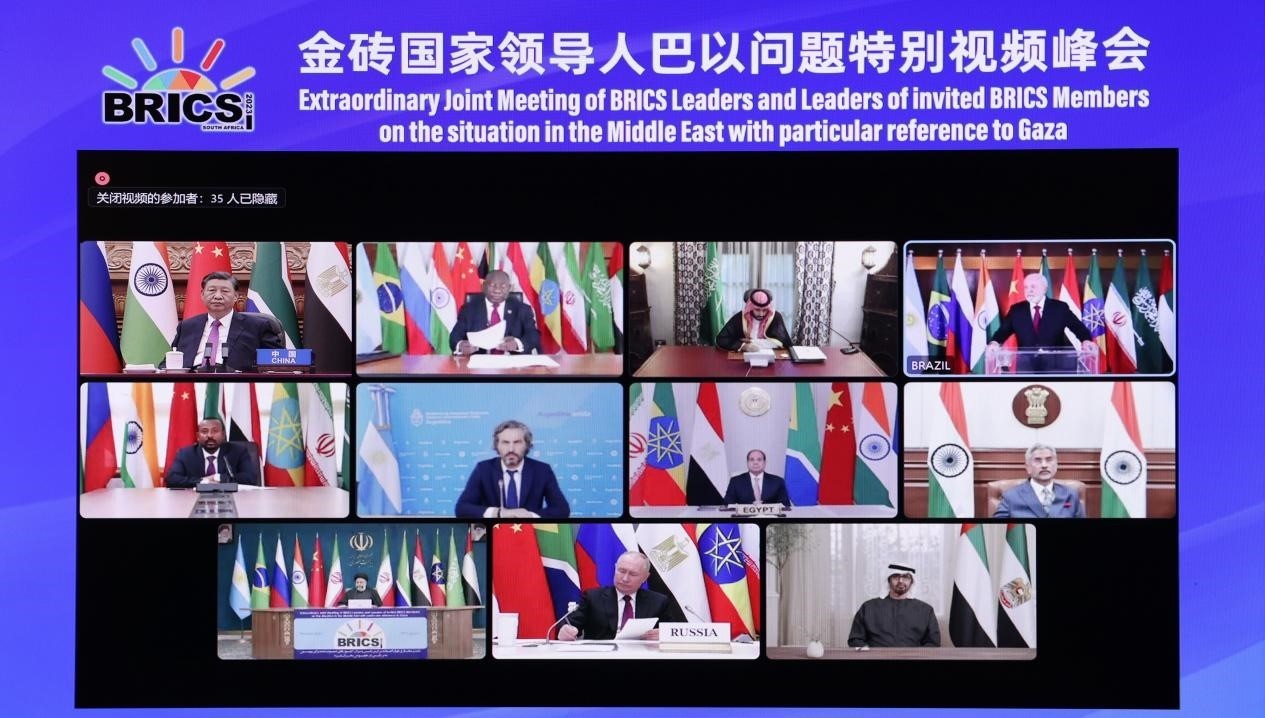 金磚國家始終是國際公平正義的堅(jiān)定守護(hù)者。2023年11月21日,習(xí)近平主席在北京出席金磚國家領(lǐng)導(dǎo)人巴以問題特別視頻峰會(huì)并提出三點(diǎn)正義主張。
