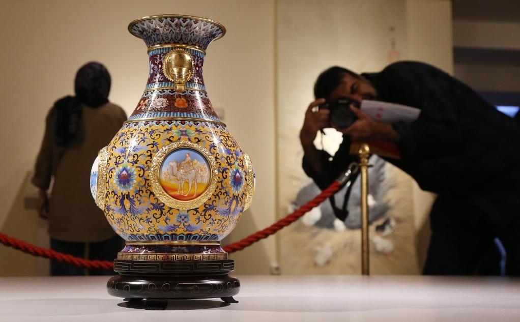 2024年10月12日,在伊朗首都德黑蘭的馬利克國家博物館,觀眾在“絲路長云——中國藝術(shù)文化精品展”現(xiàn)場拍攝展品。新華社記者 沙達(dá)提 攝