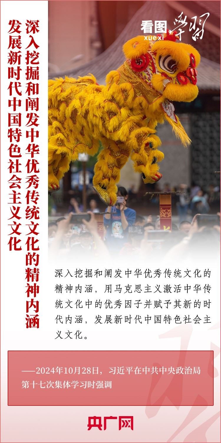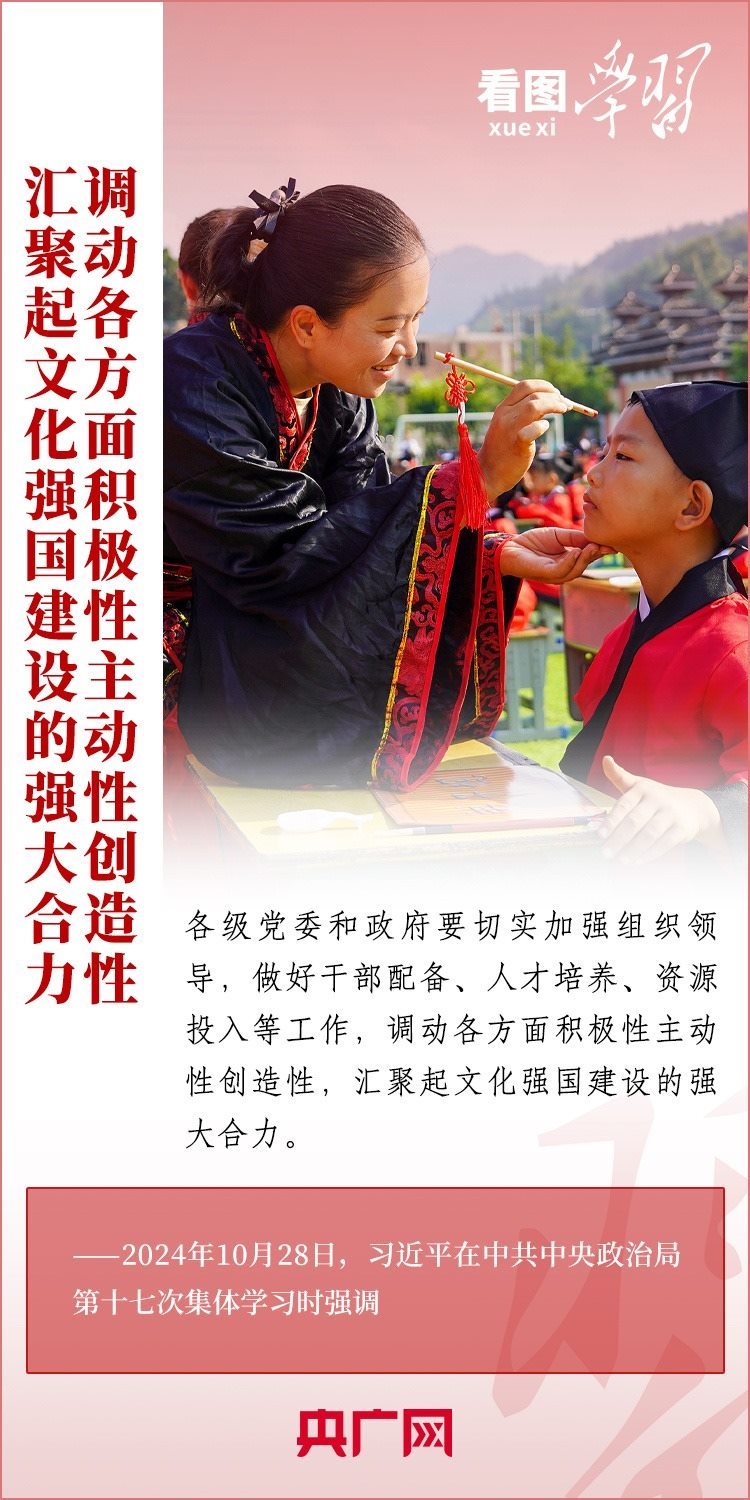 建設(shè)文化強(qiáng)國是全黨全社會的共同任務(wù)。10月28日,中共中央政治局就建設(shè)文化強(qiáng)國進(jìn)行第十七次集體學(xué)習(xí)。習(xí)近平總書記在聽取講解和討論后發(fā)表重要講話,就錨定2035年建成文化強(qiáng)國戰(zhàn)略目標(biāo)作出最新部署,強(qiáng)調(diào)要“不斷發(fā)展具有強(qiáng)大思想引領(lǐng)力、精神凝聚力、價值感召力、國際影響力的新時代中國特色社會主義文化,不斷增強(qiáng)人民精神力量,筑牢強(qiáng)國建設(shè)、民族復(fù)興的文化根基?!币黄饋韺W(xué)習(xí)!