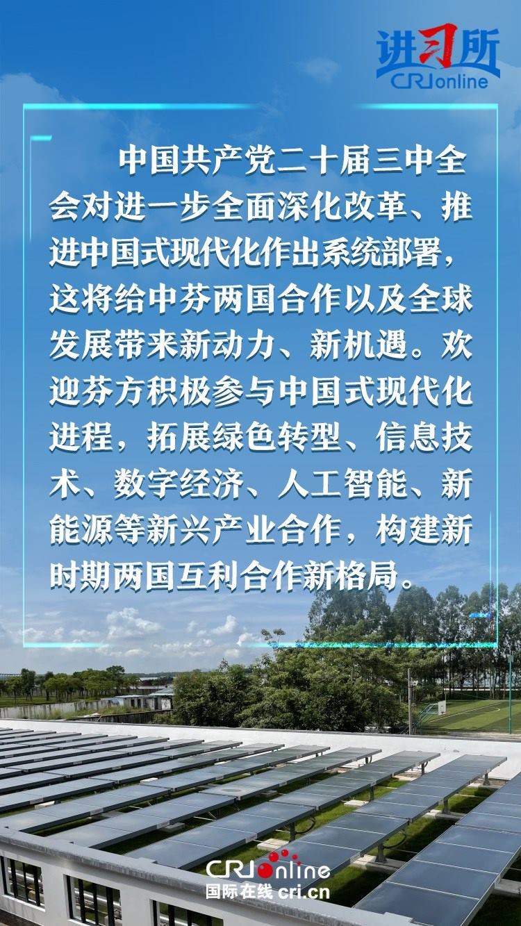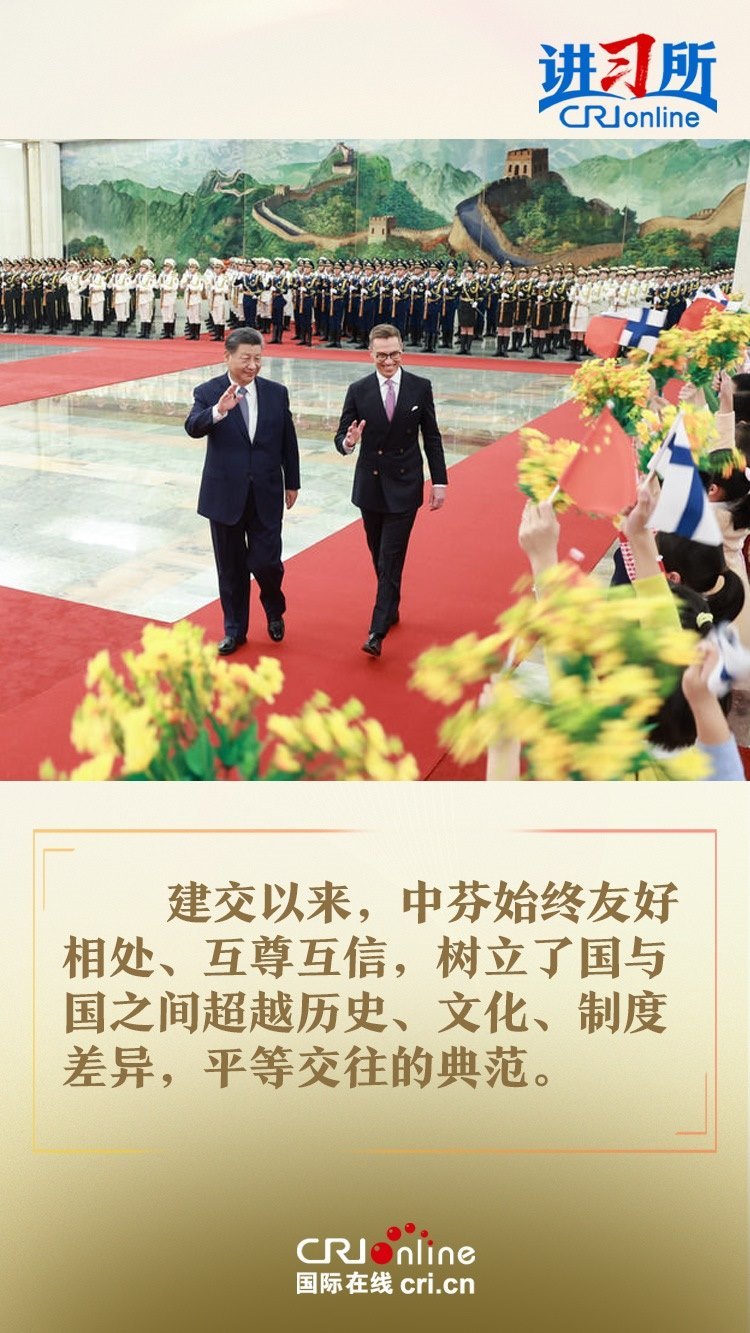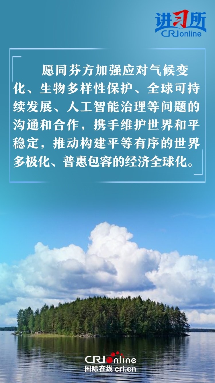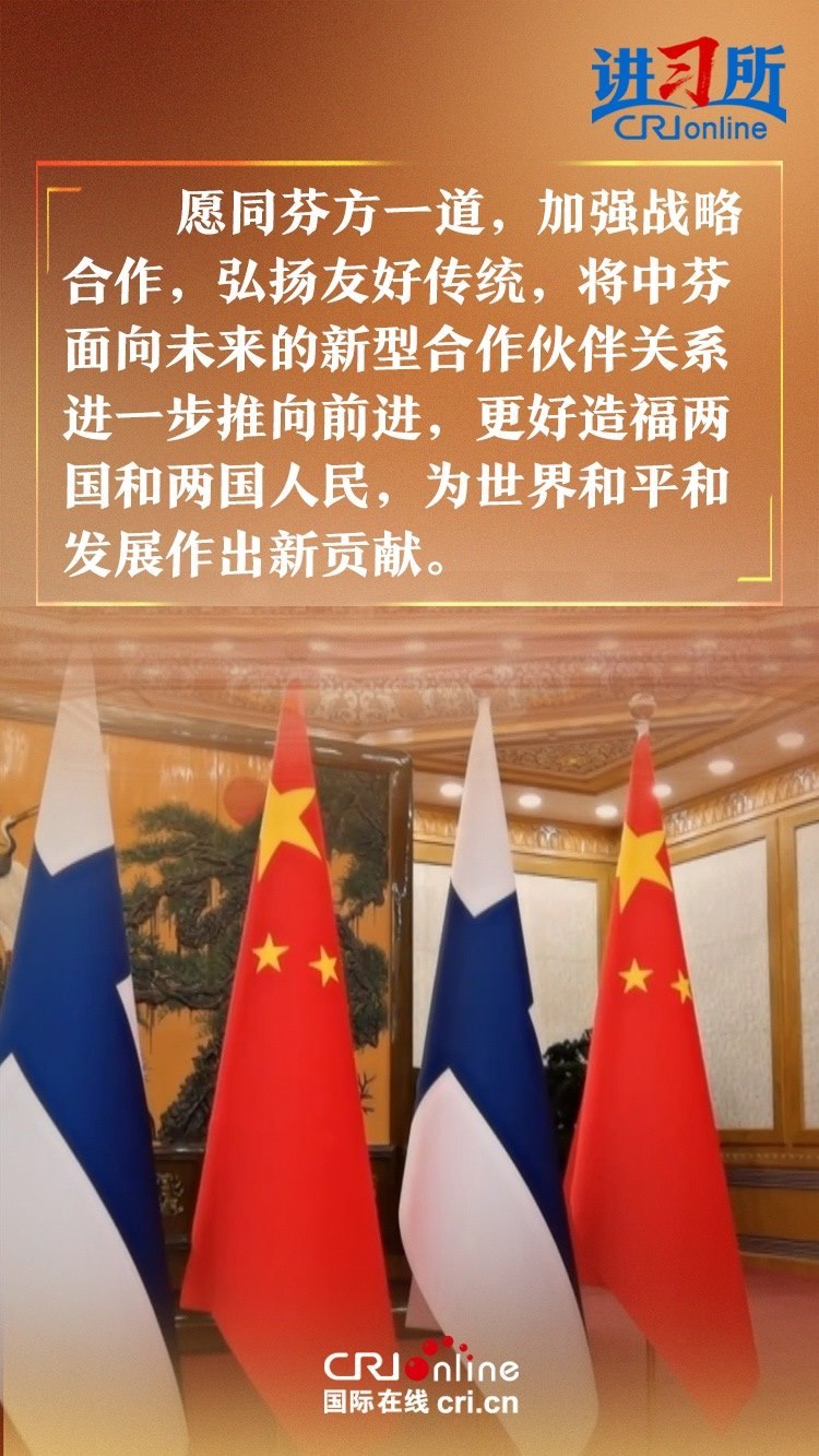 習(xí)近平指出,建交以來,中芬始終友好相處、互尊互信,樹立了國與國之間超越歷史、文化、制度差異,平等交往的典范。中方愿同芬方一道,加強(qiáng)戰(zhàn)略合作,弘揚友好傳統(tǒng),將中芬面向未來的新型合作伙伴關(guān)系進(jìn)一步推向前進(jìn),更好造福兩國和兩國人民,為世界和平和發(fā)展作出新貢獻(xiàn)。