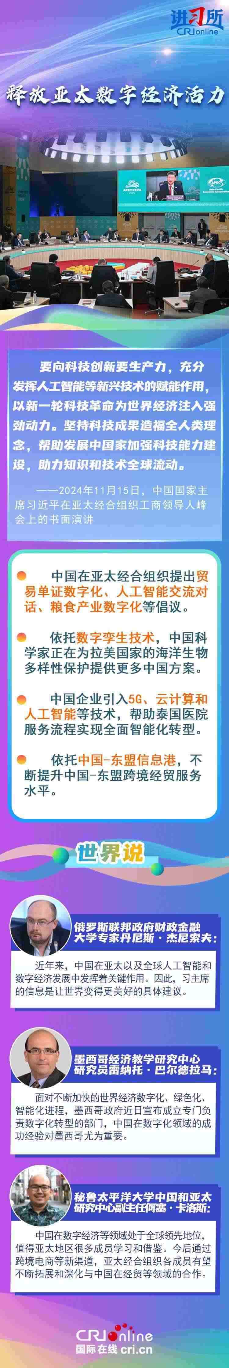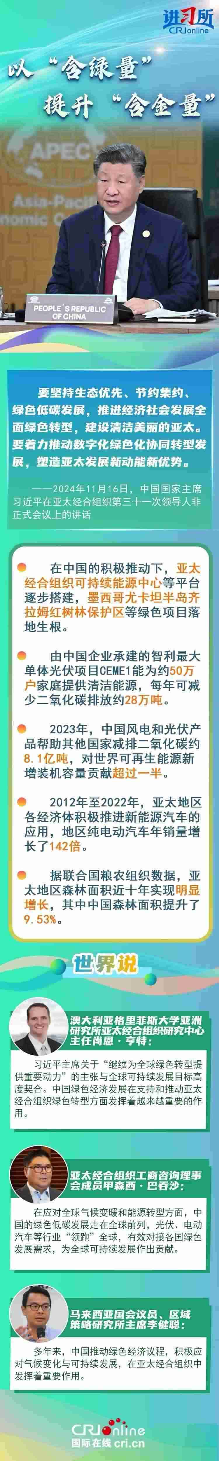 亞太之大,容得下大家共同發(fā)展。當(dāng)前單邊主義、保護(hù)主義蔓延,世界經(jīng)濟(jì)正經(jīng)受逆水行舟、不進(jìn)則退的嚴(yán)峻考驗(yàn)。習(xí)近平主席從促進(jìn)亞太合作大局出發(fā),圍繞“綠色”“創(chuàng)新”“普惠包容”等議題,闡釋中國行動,強(qiáng)調(diào)要守正創(chuàng)新,擦亮開放亞太、包容亞太的金字招牌,打造綠色亞太、數(shù)字亞太的新招牌,推動構(gòu)建亞太命運(yùn)共同體。